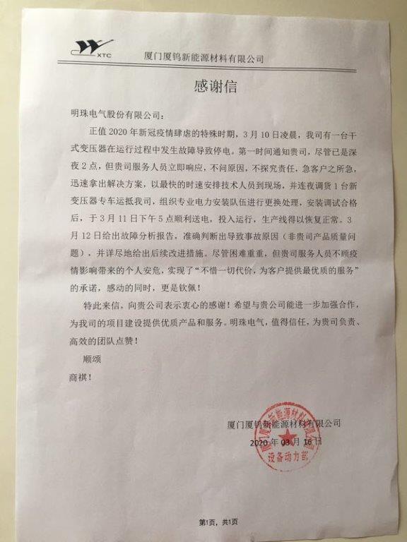 盡管過程充滿艱難險阻,但明珠團隊不顧個人安危,憑借敬業(yè)精神,客戶為之深深感動和欽佩!我們用自身的實力和執(zhí)行力將此事件造成的不利影響降到最低。“明珠電氣,值得信任,為貴司負責任、高效的團隊點贊!”面對客戶感謝信中給予我們的肯定和贊賞,內心充滿了無限的感動,更增強了我們努力提供好服務的無限信心和動力!