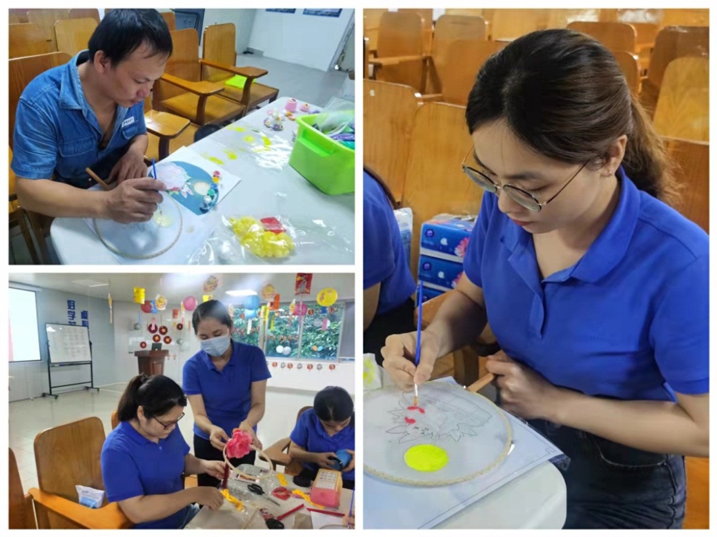 活動現(xiàn)場,除了妙趣橫生的燈謎外,還設(shè)了DIY彩燈,描繪扇面,黏土制作等手工活動。從散落的零件到精致可愛的彩燈,從空白的扇面到活潑靈動的團(tuán)扇,從五顏六色的黏土到俏皮生動的作品,不同的形式,卻處處都洋溢著節(jié)日的歡樂與我們對美好生活的祈愿。